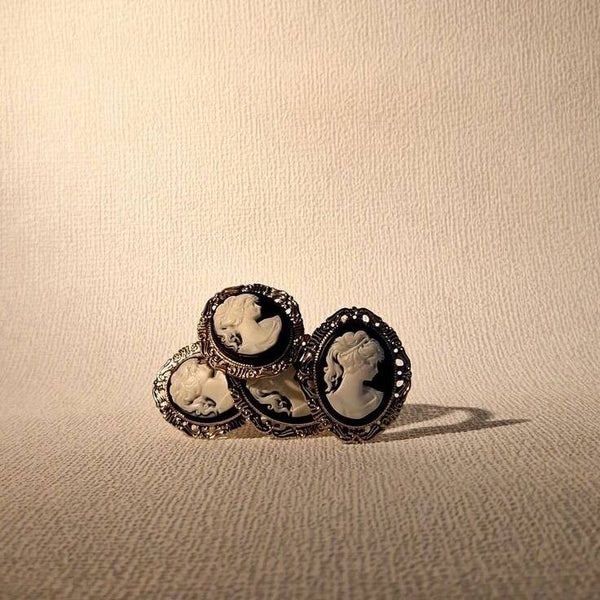Set van 4 servetringen met 'camee'. Gemaakt van staal en siliconen. (Onbreekbaar gelukkig!) In prima staat.