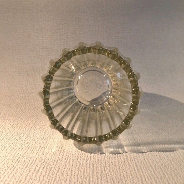 Zware glazen vaas met ribbels waartussen het glas verticaal gematteerd is. Goede staat. Binnenkart heeft (zoals veel vintage vazen) wel een beetje aanslag.