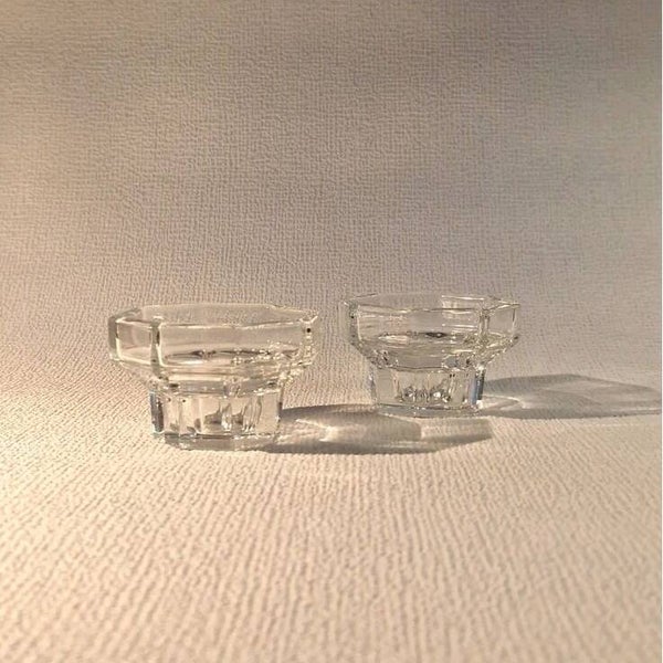 Set van 2 hexagon glazen kandelaren in perfecte staat.Zowel een waxinelicht als dinerkaars past hier mooi in, door de hoeken reflecteren ze elkaars vlam heel mooi!5 cm hoog x 7,5 cm breed