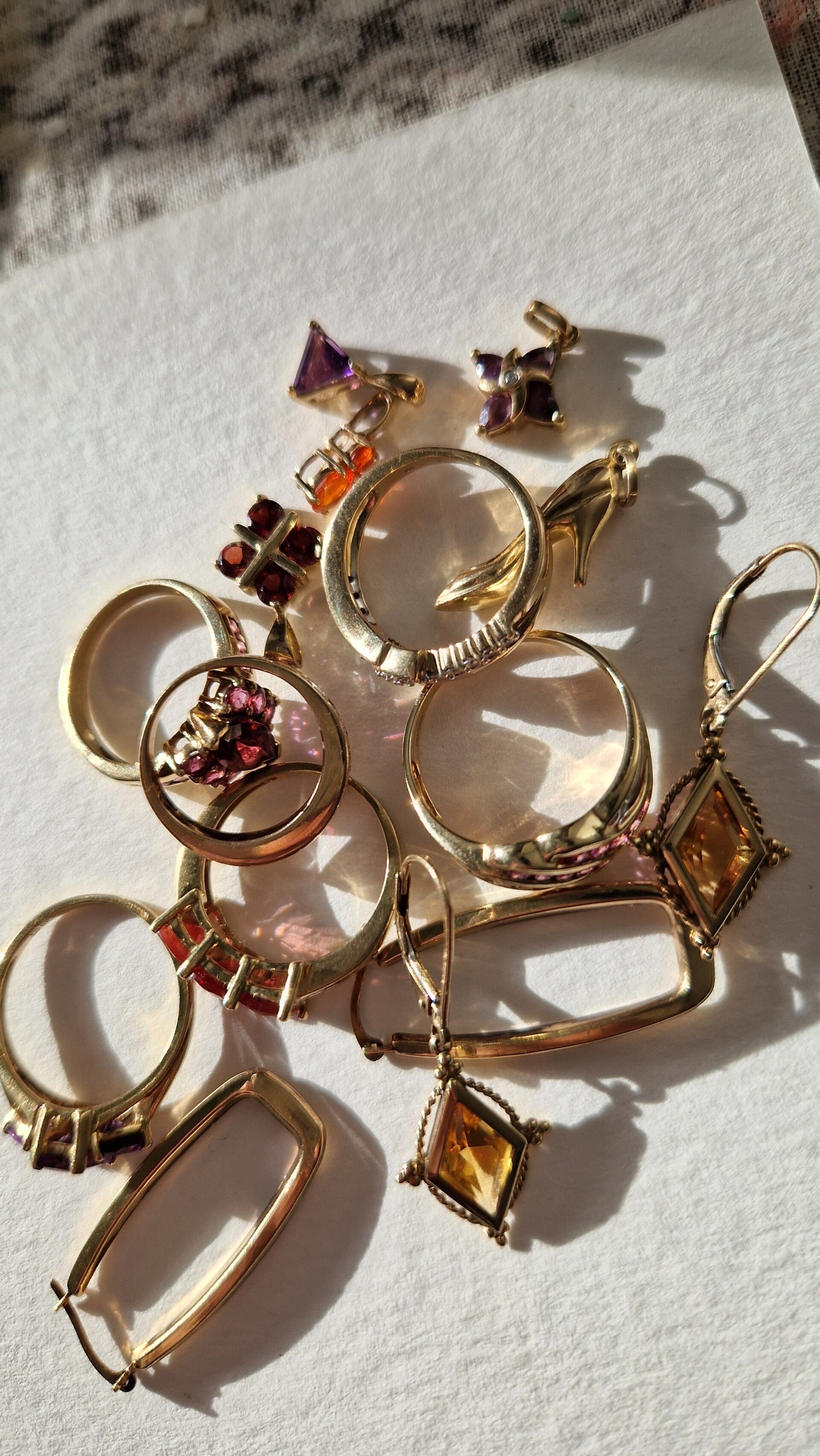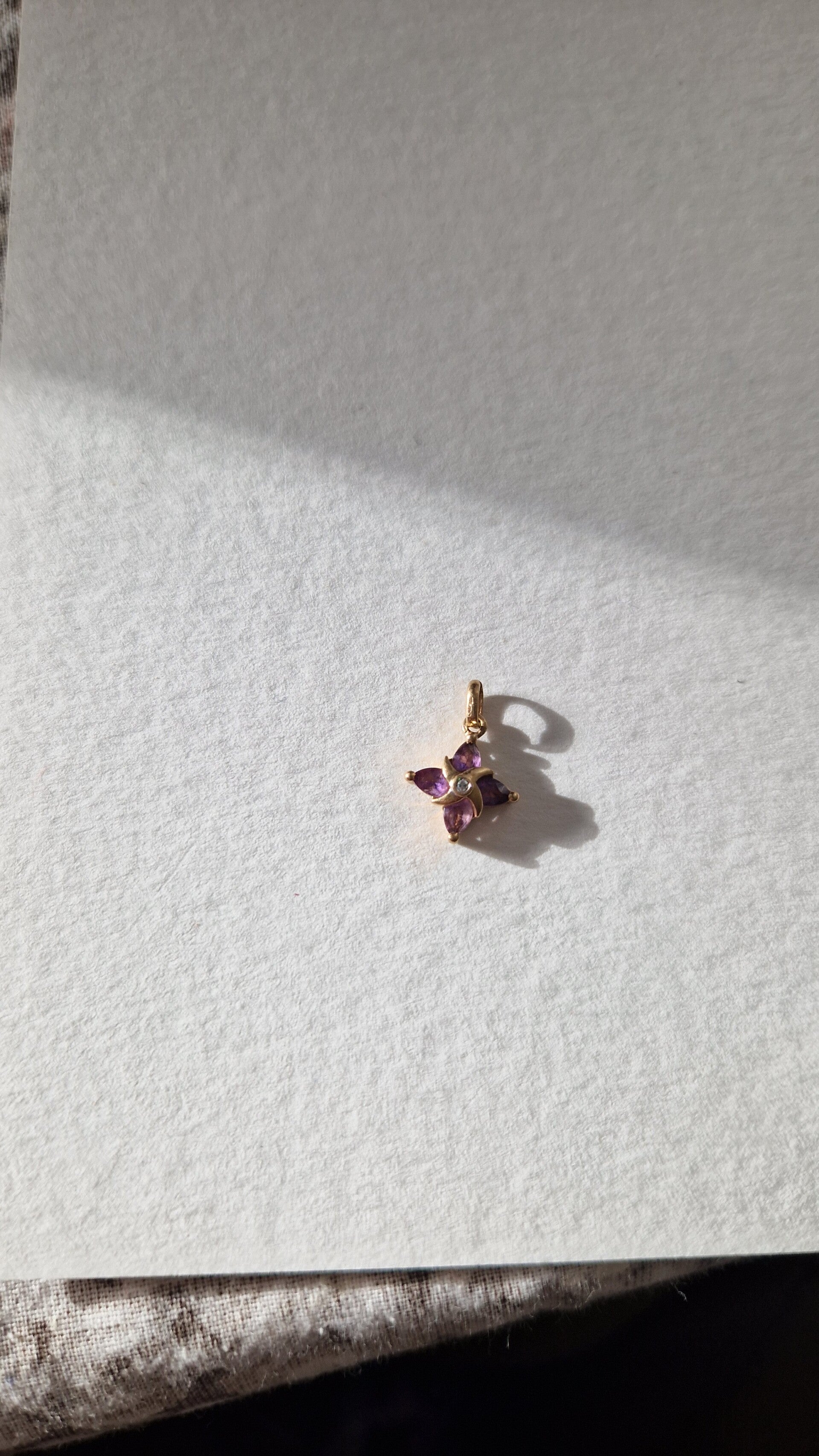 9 karaat goudBezet met 4 peervormige amethisten en een diamant in het middenAfmeting 1,5 x 1 cm inclusief hangoog